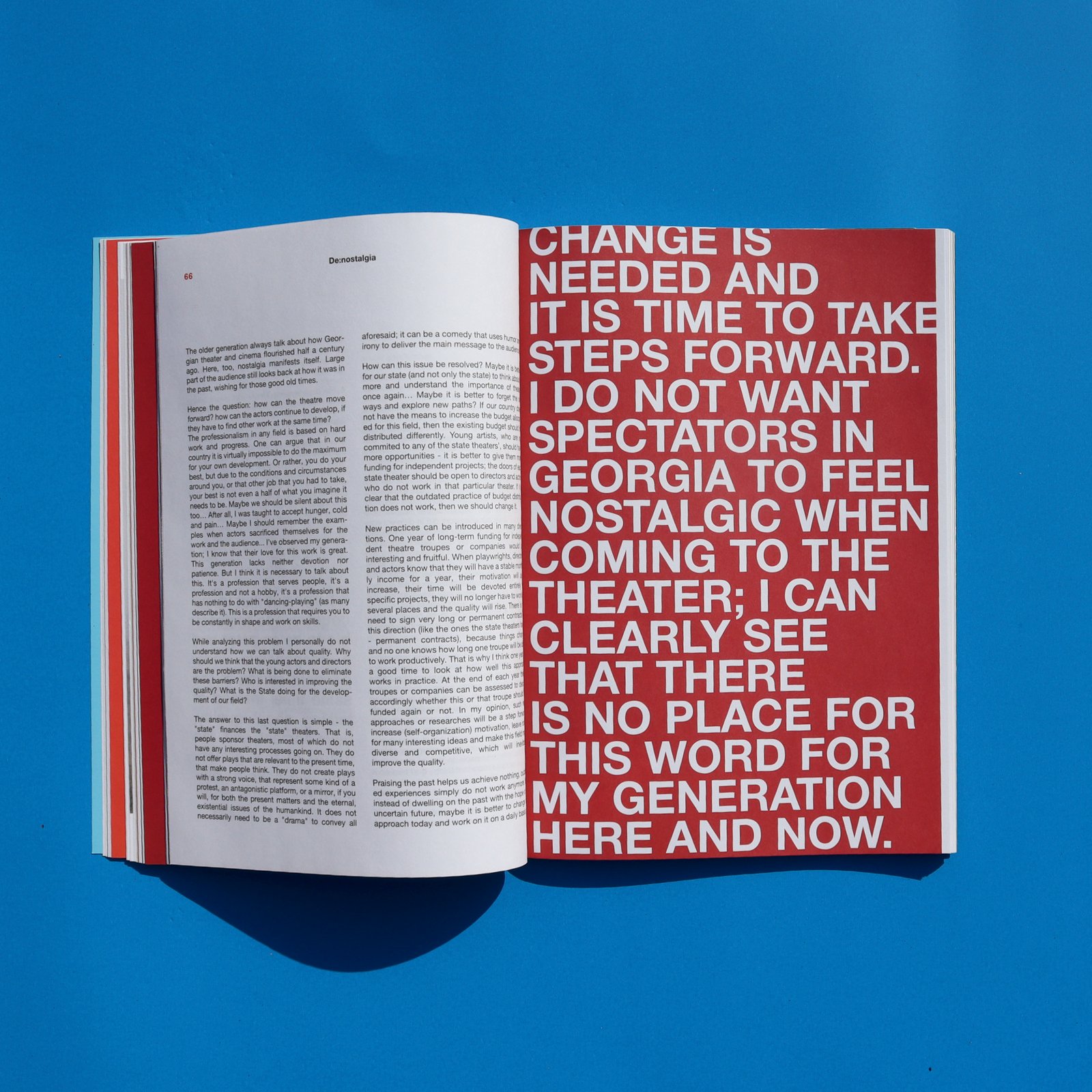 Now more than ever Georgia urgently needs to re-evaluate its past experiences. Polarised media sources create two separate realities where independent honest and analytical dialogues are not taking place. It is only natural that in this given situation no one is rethinking the past because no one is listening to one another.it seems as if there is no time to listen and as a result we are left with a ‘seeming’ reality that relates to know one and create a state that is wanted by no one. De: nostalgia is an attempt to fill this lack of dialogue and present an independent publication, which offers diverse and honest discussions.